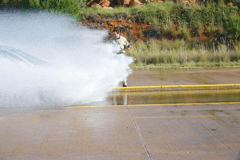 Теперь — тесты на аквапланирование в повороте. Короткий сектор замкнутой асфальтовой трассы (круг диаметром 200 м) представляет собой «ванну» с водой глубиной около 10 мм. Водитель наматывает круги, каждый раз увеличивая скорость на 1 км/ч, и фиксирует момент, когда автомобиль начинает уплывать с заданной поворотом руля траектории. После этого он продолжает увеличивать скорость — до тех пор, пока автомобиль не выскользнет за пределы размеченного коридора. Это и есть предельная скорость выполнения маневра.