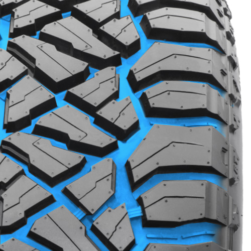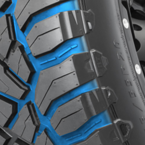 Протекторный узор разработан с акцентом на максимальную эффективность как на шоссе, так и в условиях бездорожья. Квадратный профиль и массивные плечевые блоки со смещенными зубьями создают улучшенное пятно контакта, повышая устойчивость автомобиля на поворотах и неровных участках. Специальные камневыталкиватели предотвращают накопление мусора в канавках, способствуя непрерывному самоочищению и поддержанию стабильных рабочих характеристик. Центральная зона протектора усиливает курсовую устойчивость, что особенно важно при движении с грузом.